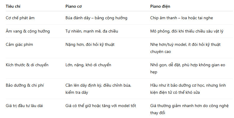 Việc phân biệt rõ đàn piano cơpiano điện không chỉ là câu hỏi “loại nào tốt hơn” mà là chọn loại nào phù hợp với mục đích sử dụng, không gian, ngân sách và kế hoạch dài hạn của bạn.