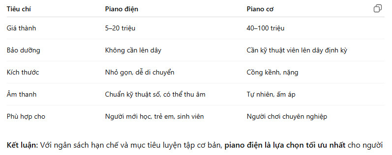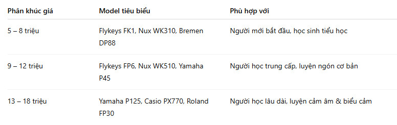 Kết luận: Với ngân sách hạn chế và mục tiêu luyện tập cơ bản, piano điện là lựa chọn tối ưu nhất cho người mới tập tại các khu vực Long Biên – Đông Anh – Gia Lâm.