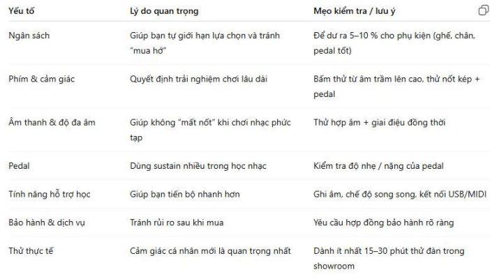 Ngược lại, mua đàn quá đắt từ đầu (với những chức năng cao cấp mà bạn chưa dùng) gây lãng phí. Vì vậy, “giá hợp lý” chính là mức giá mà bạn có thể chi trả, nhưng vẫn đảm bảo các yếu tố kỹ thuật quan trọng để học tốt.