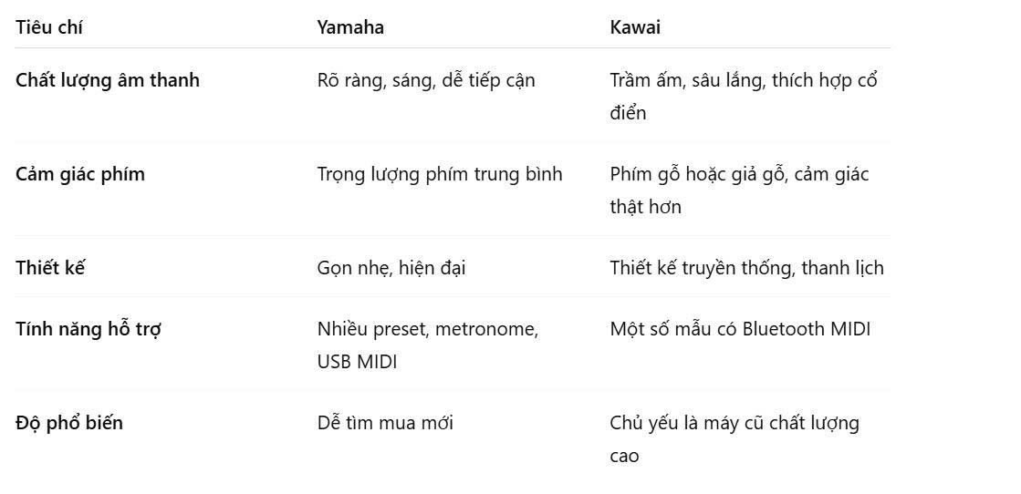 Cả Yamaha và Kawai đều là những thương hiệu đàn piano uy tín đến từ Nhật Bản, phù hợp với ngân sách 10-15 triệu nếu bạn biết cách lựa chọn. Nếu bạn ưu tiên chất âm sáng, dễ học, hãy chọn Yamaha. Nếu bạn thích chất âm cổ điển, cảm giác phím thật, hãy cân nhắc Kawai.