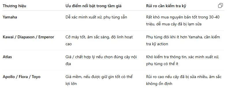 • Nếu ngân sách 30-40 triệu, bạn nên ưu tiên Yamaha cũ (nếu tìm được cây tốt và đã qua chỉnh sửa) hoặc Kawai / Diapason nếu có cơ hội.
